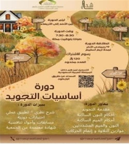 يسُر مقرأة أشجان التابعة لجمعية الذكر الحكيم عن إقامة :- دورة أساسيات التجويد💛 أنيري ظلام قلبك بنورِ حروفِه هو زادُ قلبك والنعيم الباقي🍁 -الحلقة برسوم. -الحلقة خاصة برواية حفص عن عاصم. -الحلقة جماعية و يستلزم حضورها كاملة. -الحلقة أربع أيام في الأسبوع. -يتاح الاشتراك في الدورة من داخل السعودية. -تبدأ الحلقة: ٩ - ٦- ١٤٤٧هـ للتسجيل وكافّة التفاصيل: https://forms.gle/ZouTCR4UCWPWXRkJ7 لُطفًا اقرأي إعلان الدورة جيدًا قبل الانضمام☁